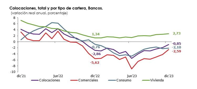 Las colocaciones del sistema bancario cayeron 0,85% en 12 meses, principalmente, por el retroceso de las colocaciones comerciales.