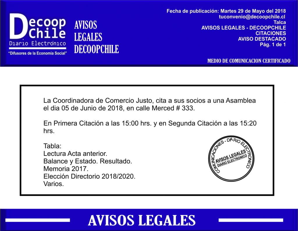 Se cita a Asamblea General: La Coordinadora de Comercio Justo, que se llevará a cabo el próximo 05 de Junio.