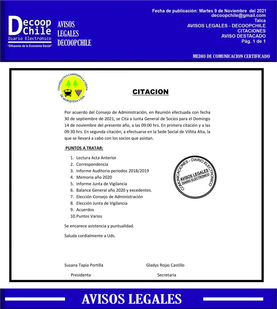 Se cita a Junta General de Socios de la Cooperativa Campesina La Viñita, que se llevara a cabo el próximo 14 de Noviembre de 2021. DESCARGAR PDF