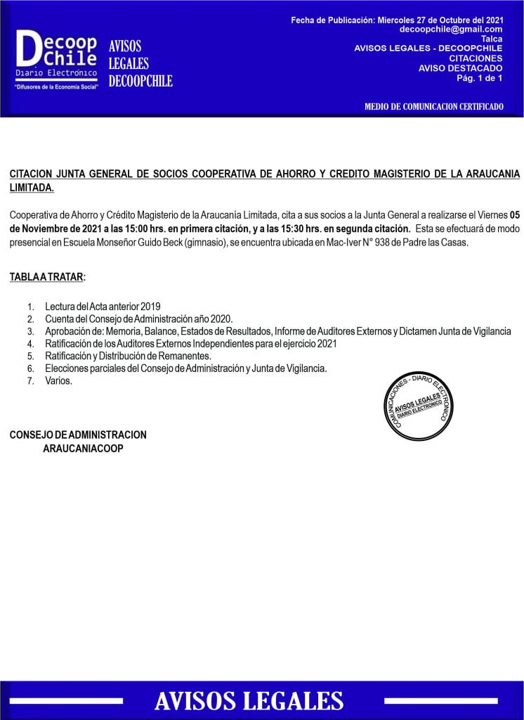 Se cita a Junta General de Socios de la Cooperativa de Ahorro y Crédito Magisterio de la Araucanía Ltda, que se llevara a cabo el próximo 5 de Noviembre de 2021. DESCARGAR PDF