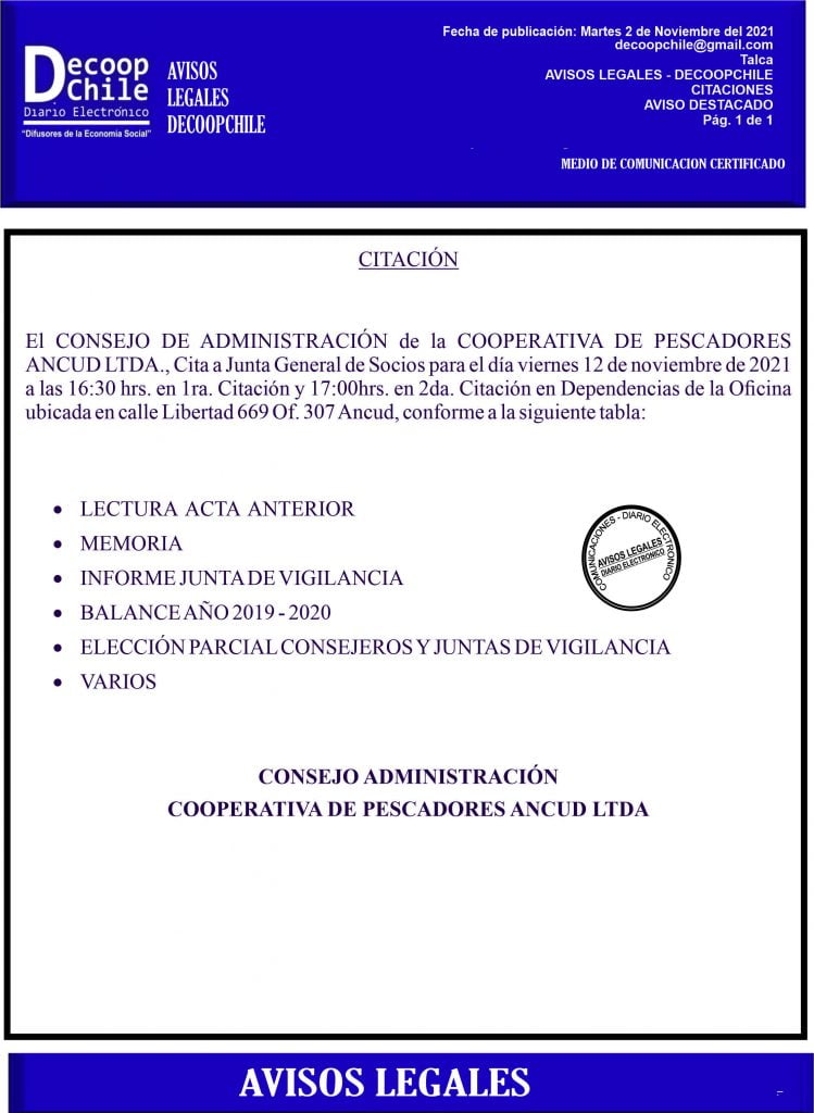 Se cita a Junta General de Socios de la Cooperativa de Pescadores Ancud Ltda, que se llevara a cabo el próximo 12 de Noviembre de 2021. DESCARGAR PDF