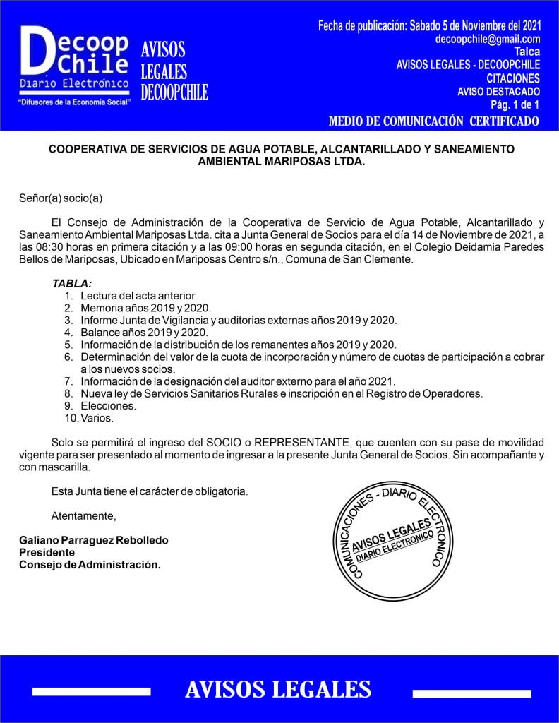 Se cita a Junta General de Socios de la Cooperativa de Servicios de Agua Potable, Alcantarillado y Saneamiento Ambiental Mariposas Ltda., que se llevara a cabo el próximo 14 de Noviembre de 2021. DESCARGAR PDF