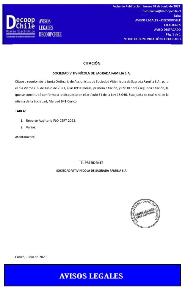 Se cita a Junta General de Accionistas, Sociedad Vitivinícola de Sagrada Familia S.A, que se llevará a cabo el próximo 09 de Junio de 2023.