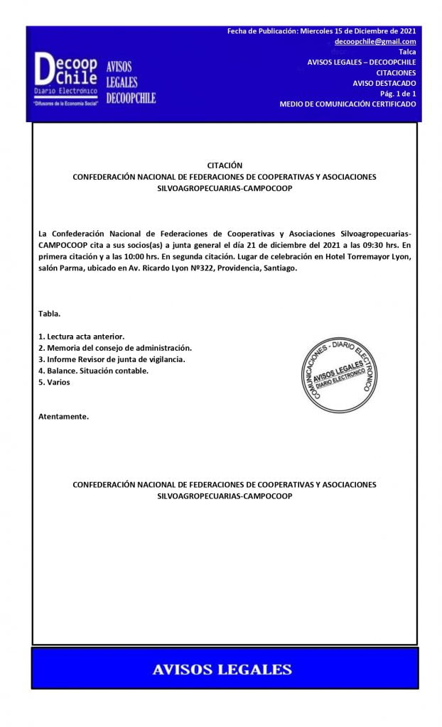 Se cita a Junta General de Socios de la Confederación Nacional de Federaciones de Cooperativas y Asociaciones Silvoagropecuarias-CAMPOCOOP, que se llevara a cabo el próximo 21 de Diciembre de 2021. DESCARGAR PDF