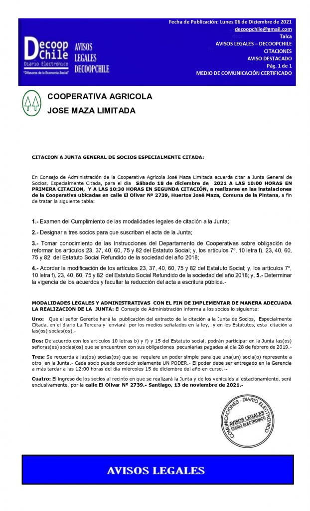 Se cita a Junta General de Socios de la Cooperativa Agrícola José Maza Ltda., que se llevara a cabo el próximo 18 de Diciembre de 2021. DESCARGAR PDF