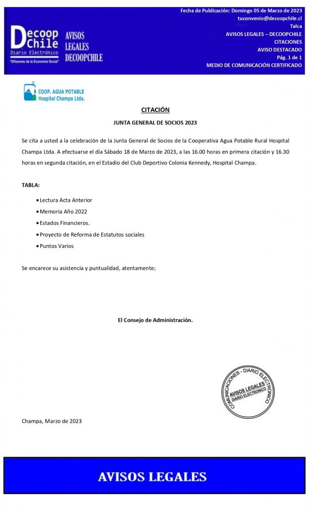 Se cita a Junta General de Socios, Cooperativa Agua Potable Rural Hospital Champa Ltda ., que se llevará a cabo el próximo 18 de Marzo de 2023.