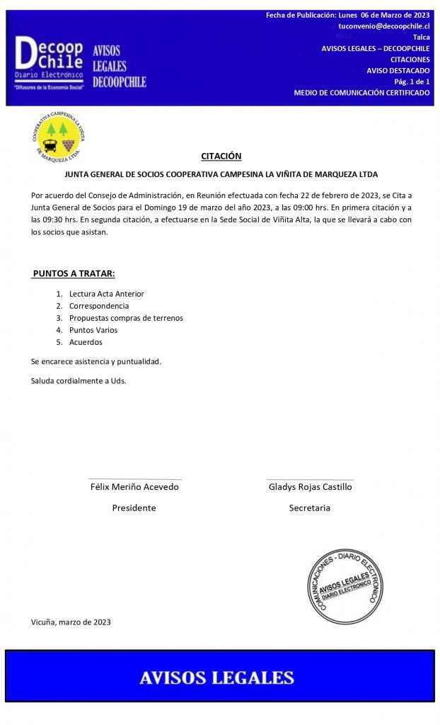 Se cita a Junta General de Socios Cooperativa Campesina La Viñita de Marqueza Ltda, que se llevará a cabo el próximo 19 de Marzo de 2023.