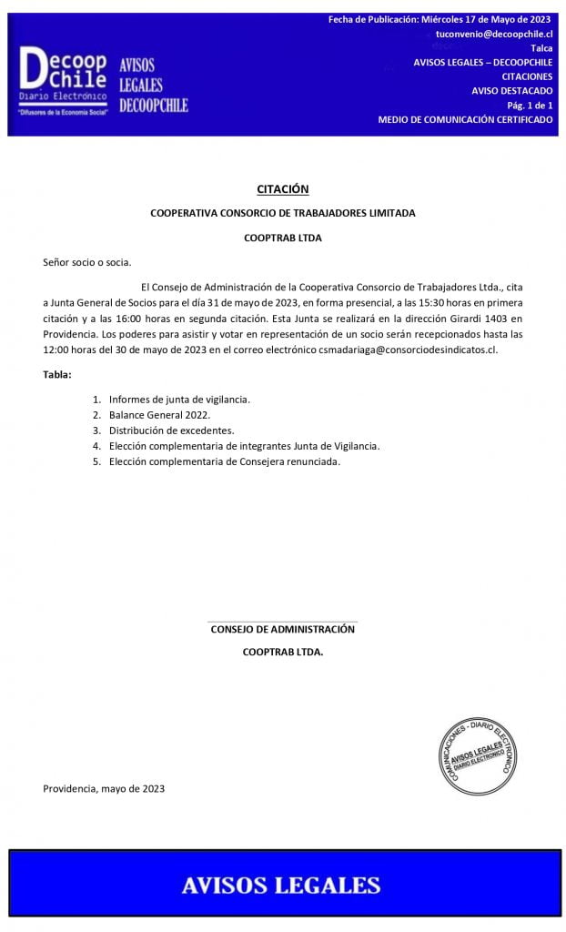 Se cita a Junta General de Socios Cooperativa Consorcio de Trabajadores Limitada «Cooptrab Ltda»., que se llevará a cabo el próximo 31 de Mayo de 2023.