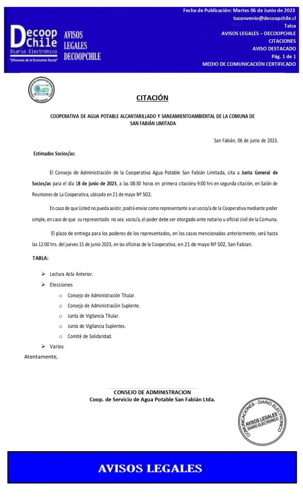 Se cita a Junta General de Socios Cooperativa de Agua Potable, Alcantarillado y Saneamiento Ambiental de la Comuna de San Fabián Ltda., que se llevará a cabo el próximo 18 de Junio de 2023.
