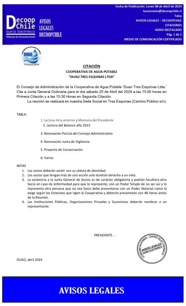 Se Cita a Junta General de Socios Cooperativa de Agua Potable «Duao Tres Esquinas Ltda» Que se Llevará a Cabo el Próximo 20 de Abril de 2024.