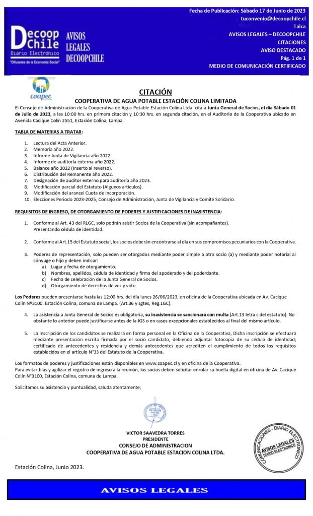 Se cita a Junta General de Socios Cooperativa de Agua Potable «Estación Colina Ltda» que se llevará a cabo el próximo 01 de Julio de 2023.