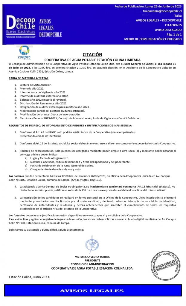 Se cita a Junta General de Socios Cooperativa de Agua Potable «Estación Colina Ltda» que se llevará a cabo el próximo 01 de Julio de 2023.