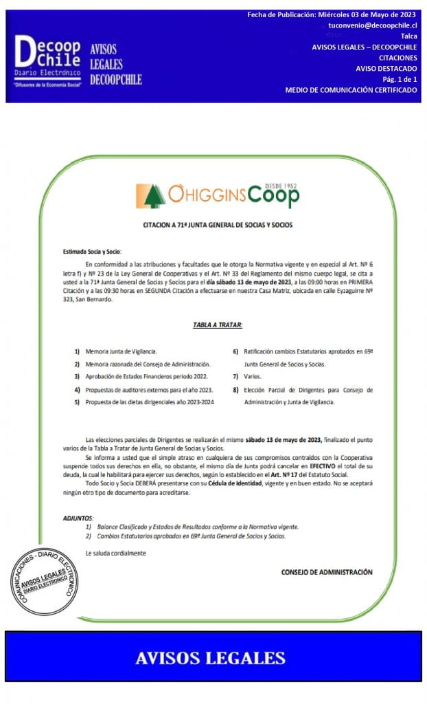 Se cita a Junta General de Socios Cooperativa de Ahorro y Crédito Ohiggins Ltda «OhigginsCoop», que se llevará a cabo el próximo 13 de Mayo de 2023.