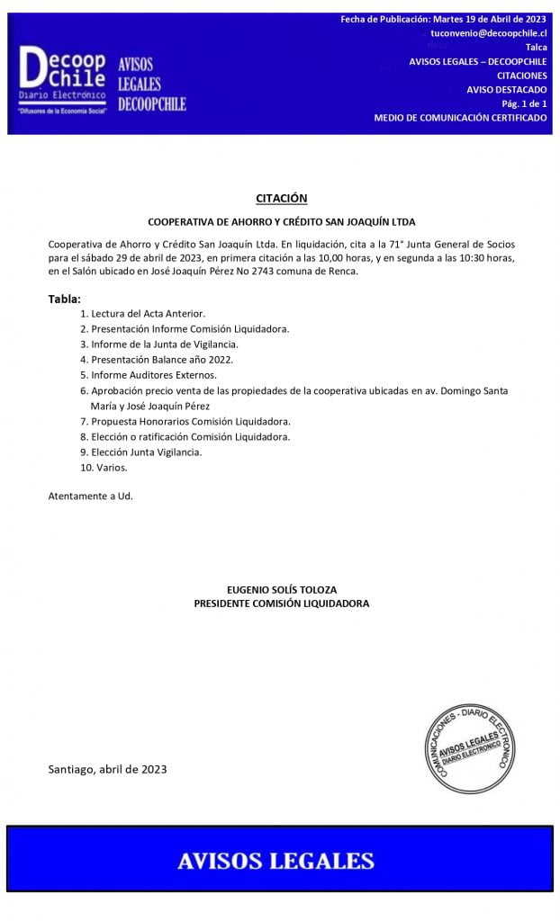 Se cita a Junta General de Socios Cooperativa de Ahorro y Crédito San Joaquín Ltda, que se llevará a cabo el próximo 29 de Abril de 2023.