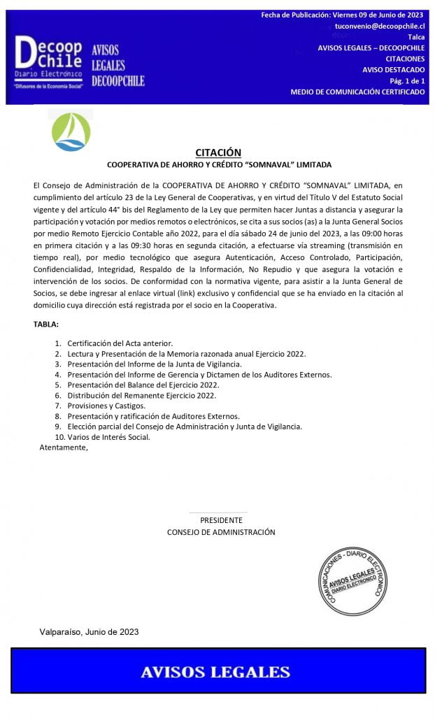 Se cita a Junta General de Socios Cooperativa de Ahorro y Crédito «Somnaval Ltda»., que se llevará a cabo el próximo 24 de Junio de 2023.