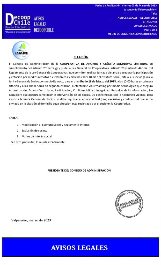 Se cita a Junta General de Socios, Cooperativa de Ahorro y Crédito Somnaval Ltda., que se llevará a cabo el próximo 18 de Marzo de 2023.