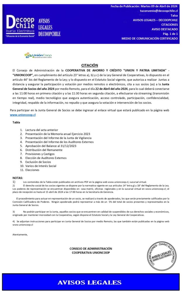 | Se Cita a Junta General de Socios Cooperativa de Ahorro y Crédito «Unión y Patria Ltda» UNIONCOOP Que se Llevará a Cabo el Próximo 22 de Abril de 2024. |