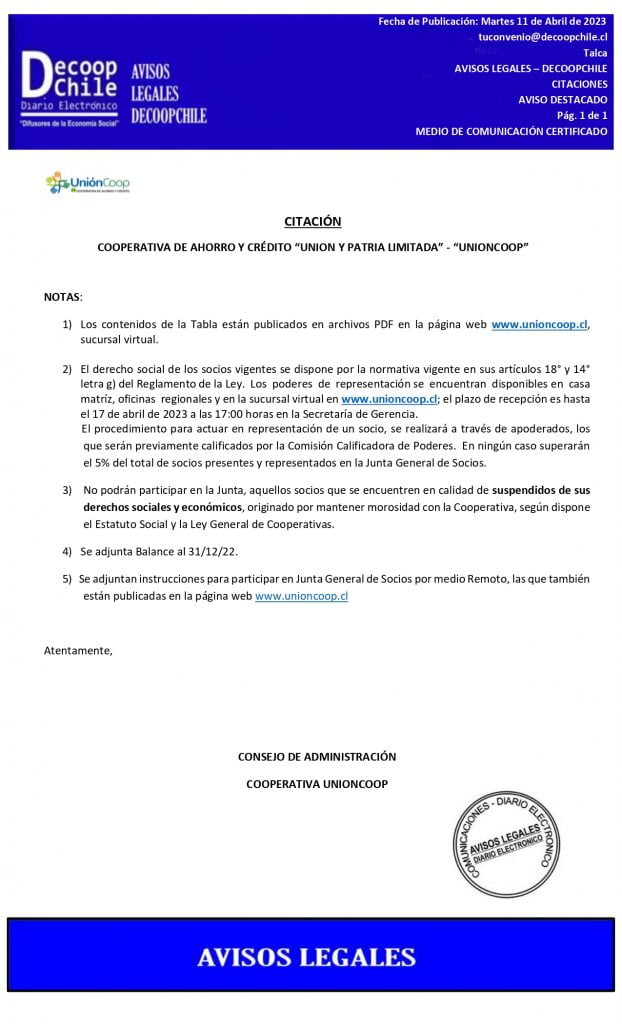 Se Cita a Junta General de Socios, Cooperativa de Ahorro y Crédito Unión y Patria Ltda, «Unioncoop» que se llevará a cabo el próximo 24 de Abril de 2023.
