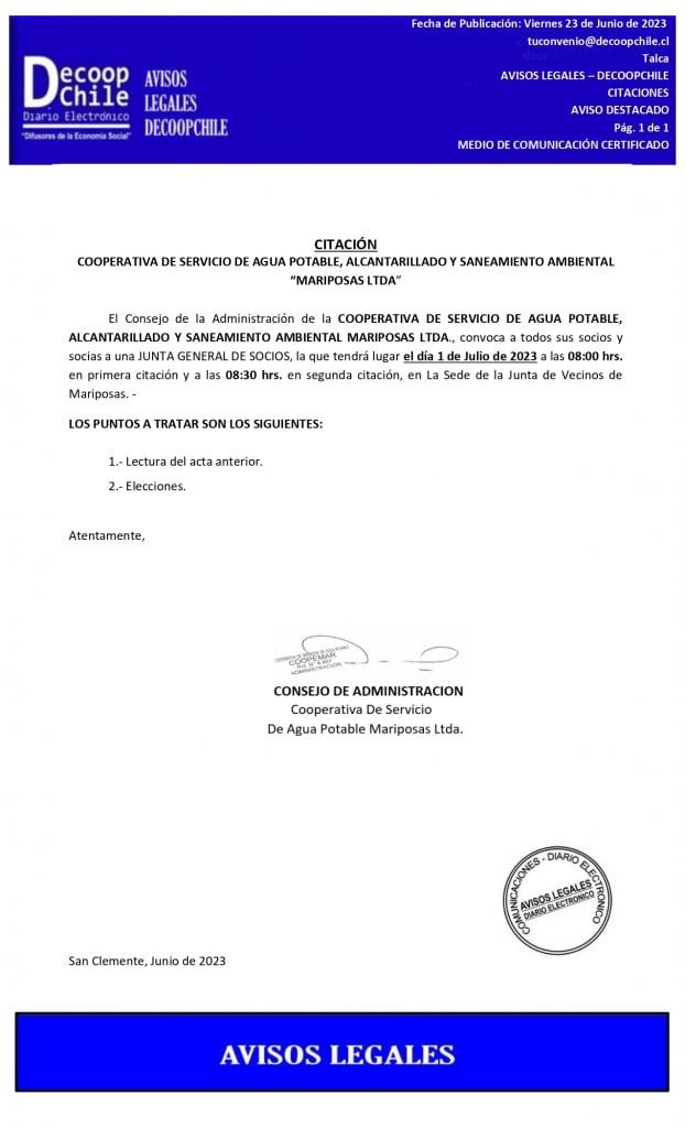 Se cita a Junta General de Socios Cooperativa de Servicio de Agua Potable, Alcantarillado y Saneamiento Ambiental «Mariposas Ltda» que se llevará a cabo el próximo 01 de Julio de 2023.