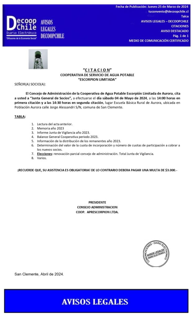 Se cita a Junta General de Socios Cooperativa de Servicio de Agua Potable «Escorpión Ltda». que se llevará a cabo el próximo 04 de Mayo de 2024.
