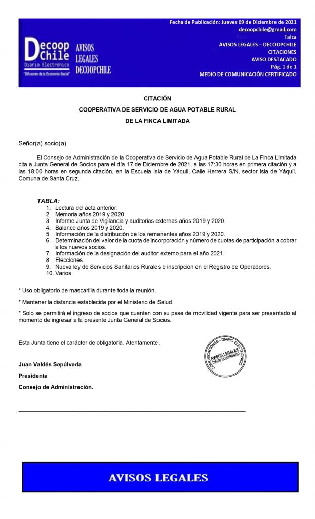 Se cita a Junta General de Socios de la Cooperativa de Servicio de Agua Potable Rural de la Finca Ltda, que se llevara a cabo el próximo 17 de Diciembre de 2021. DESCARGAR PDF