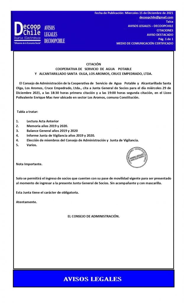 Se cita a Junta General de Socios de la Cooperativa de Servicio de Agua Potable y Alcantarillado Santa Olga, Los Aromos, Cruce Empedrado, Ltda., que se llevara a cabo el próximo 29 de Diciembre de 2021. DESCARGAR PDF