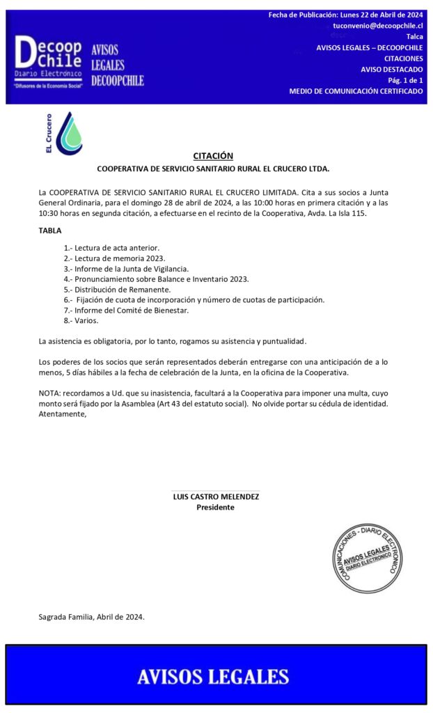 Se Cita a Junta General de Socios Cooperativa de Servicio Sanitario Rural «El Crucero Ltda». Que se Llevará a Cabo el Próximo 28 de Abril de 2024.