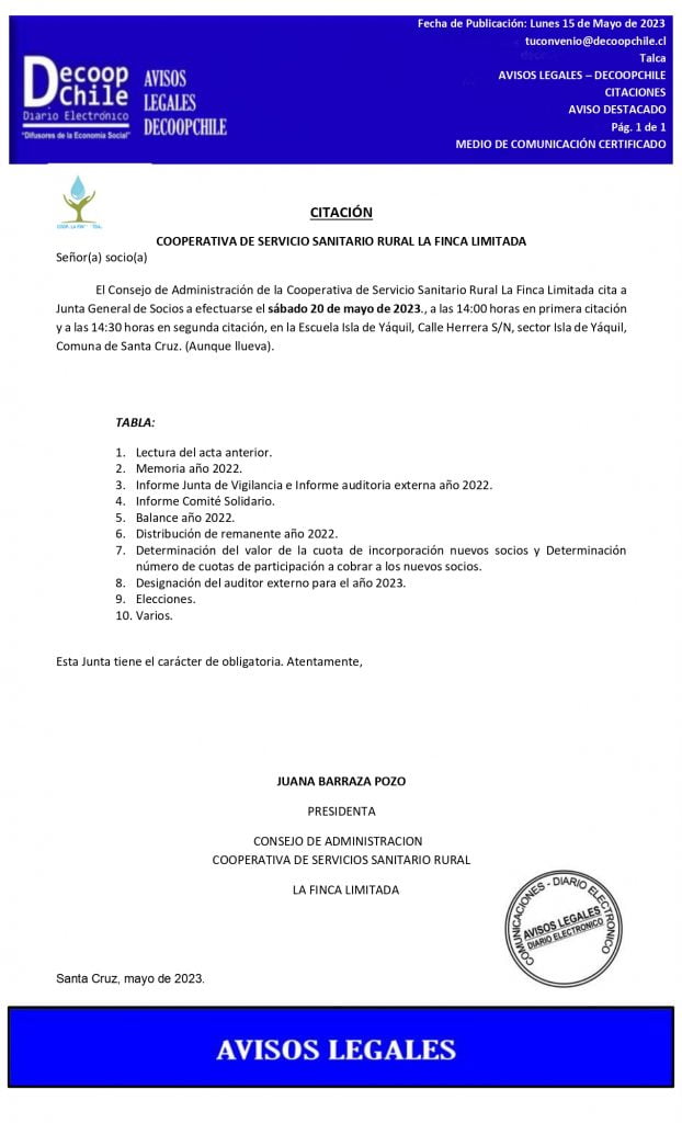 Se cita a Junta General de Socios Cooperativa de Servicio Sanitario Rural La Finca Ltda., que se llevará a cabo el próximo 20 de Mayo de 2023.