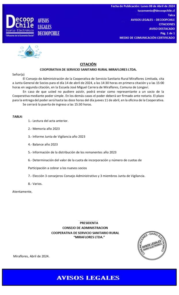 Se Cita a Junta General de Socios Cooperativa de Servicio Sanitario Rural «Miraflores Ltda» Que se Llevará a Cabo el Próximo 14 de Abril de 2024.