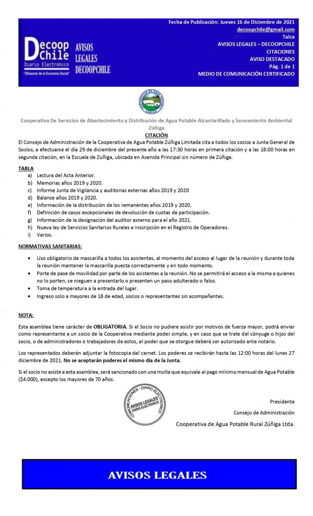 Se cita a Junta General de Socios de la Cooperativa de Servicios de Abastecimiento y Distribución de Agua Potable Alcantarillado y Saneamiento Ambiental Zuñiga, que se llevara a cabo el próximo 29 de Diciembre de 2021. DESCARGAR PDF