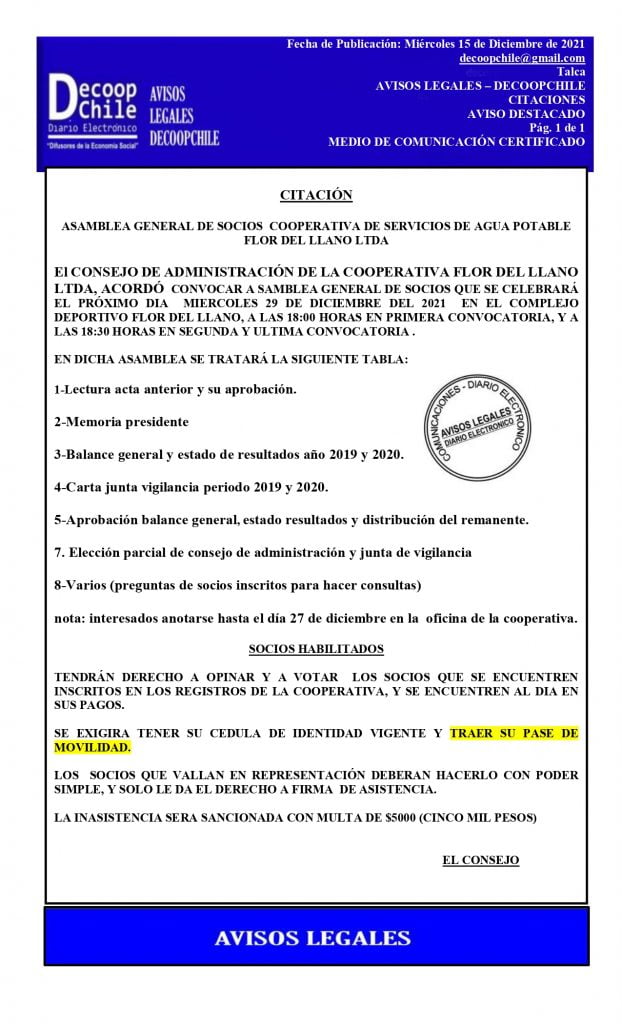 Se cita a Junta General de Socios de la Cooperativa de Servicios de Agua Potable Flor Del Llano Ltda., que se llevara a cabo el próximo 29 de Diciembre de 2021. DESCARGAR PDF