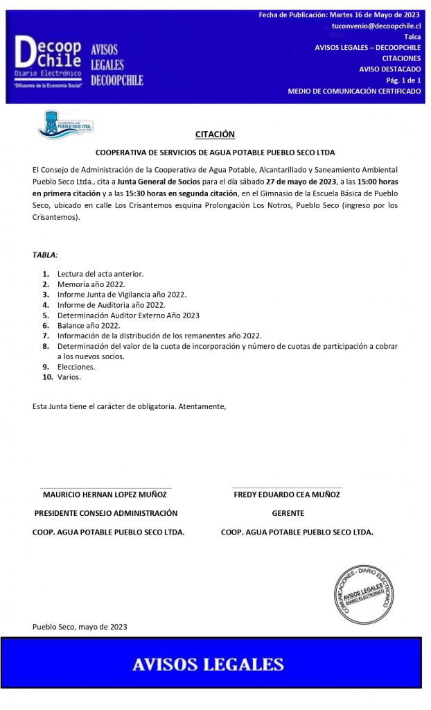 Se cita a Junta General de Socios Cooperativa de Servicios de Agua Potable «Pueblo Seco Ltda»., que se llevará a cabo el próximo 27 de Mayo de 2023.