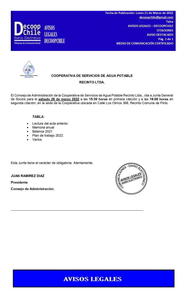 Se cita a Junta General de Socios Cooperativa de Servicios de Agua Potable Recinto Ltda., que se llevara a cabo el próximo 26 de Marzo de 2022. DESCARGAR PDF