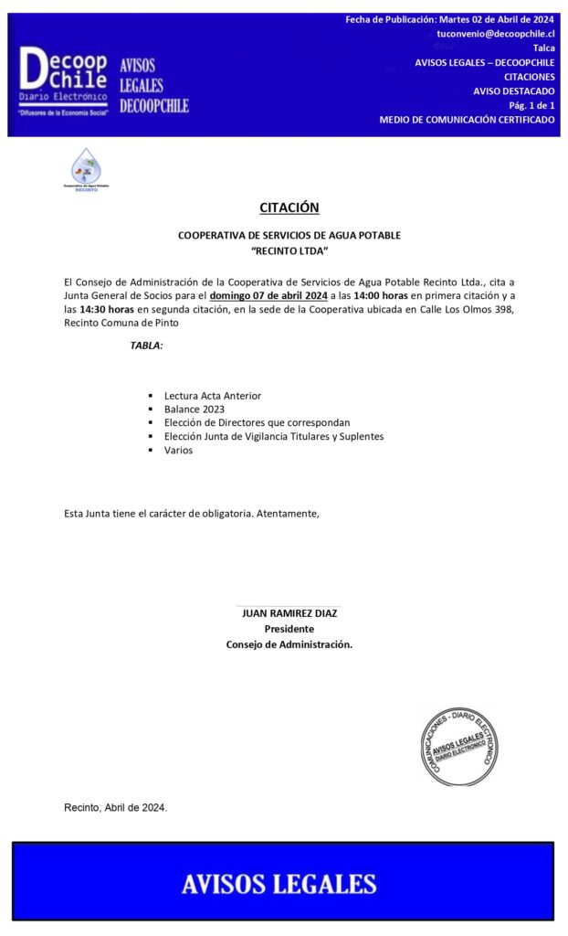 Se Cita a Junta General de Socios Cooperativa de Servicios de Agua Potable «Recinto Ltda» Que se Llevará a Cabo el Próximo 07 de Abril de 2024.