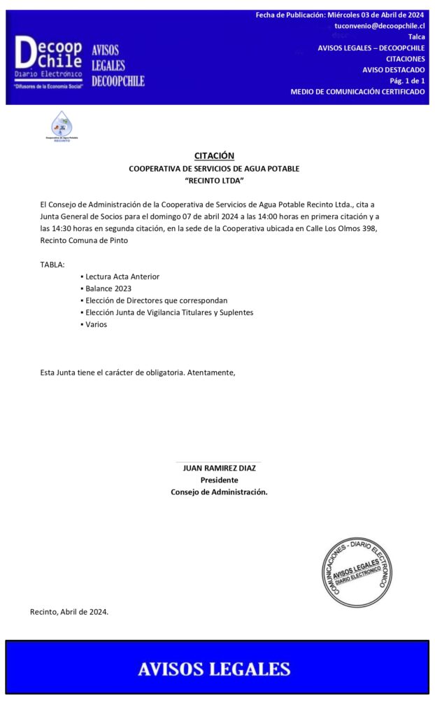 Se Cita a Junta General de Socios Cooperativa de Servicios de Agua Potable «Recinto Ltda» Que se Llevará a Cabo el Próximo 07 de Abril de 2024.