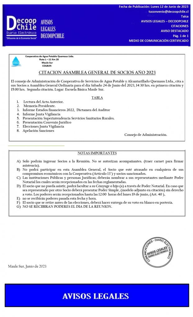 Se cita a Junta General de Socios Cooperativa de Servicios de Agua Potable y Alcantarillado «Quemaus Ltda» que se llevará a cabo el próximo 24 de Junio de 2023.