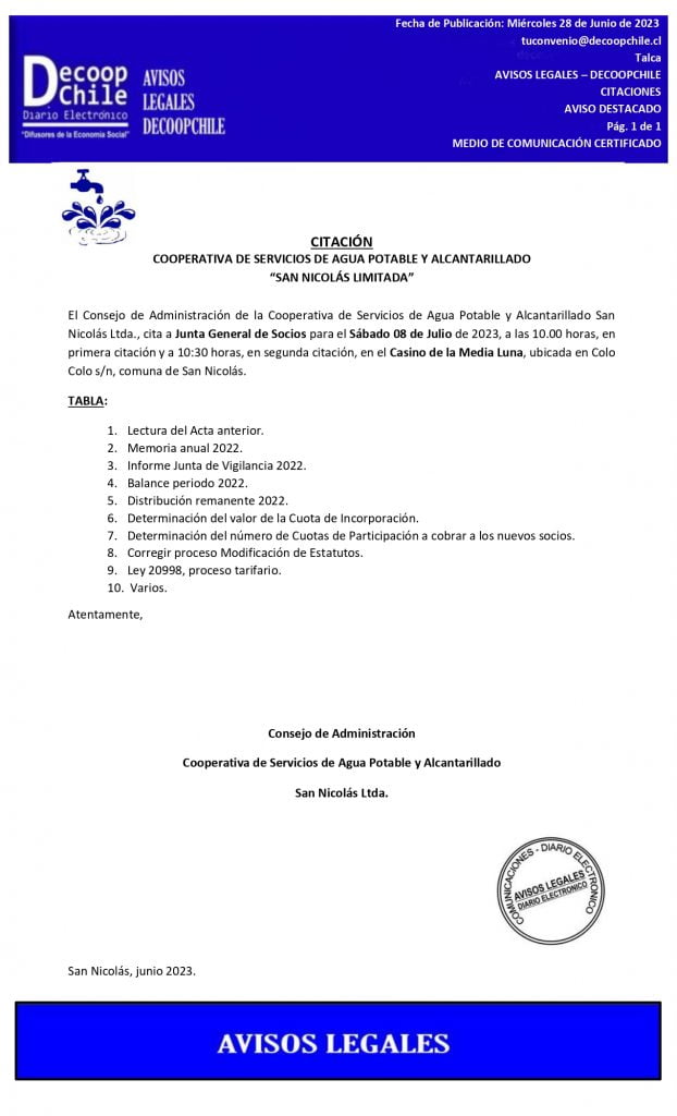 Se cita a Junta General de Socios Cooperativa de Servicios de Agua Potable y Alcantarillado «San Nicolás Ltda» que se llevará a cabo el próximo 08 de Julio de 2023.