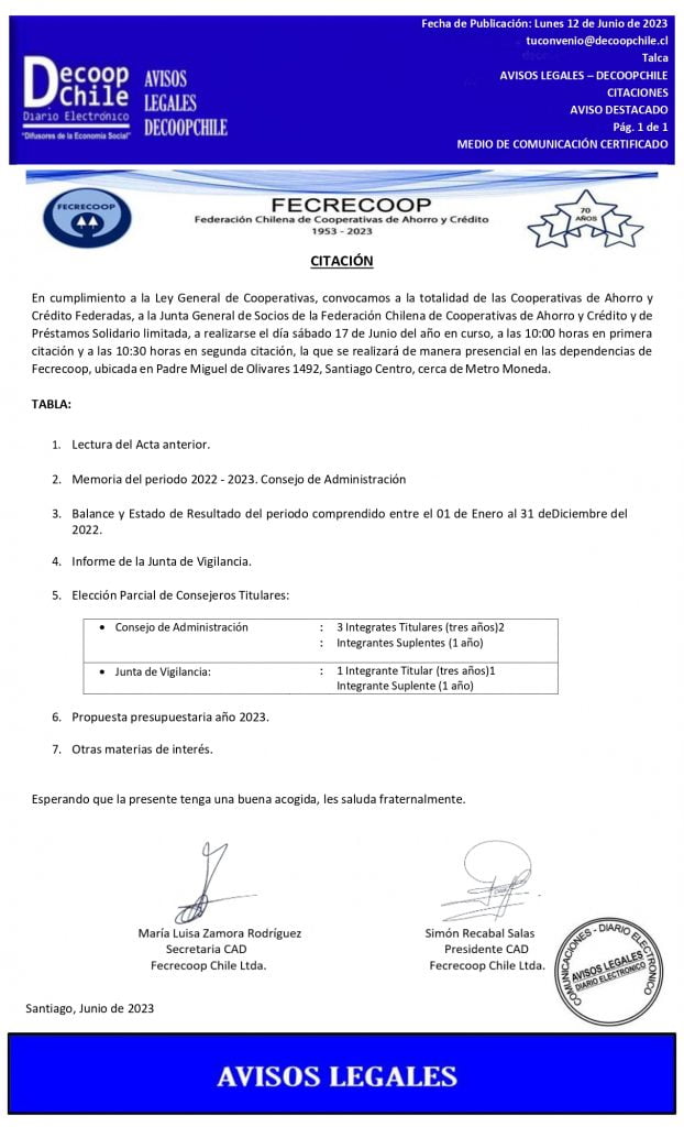 Se cita a Junta General de Socios Federación Chilena de Cooperativas de Ahorro y Crédito y de Préstamos Solidarios Ltda. «Fecrecoop» que se llevará a cabo el próximo 17 de Junio de 2023.