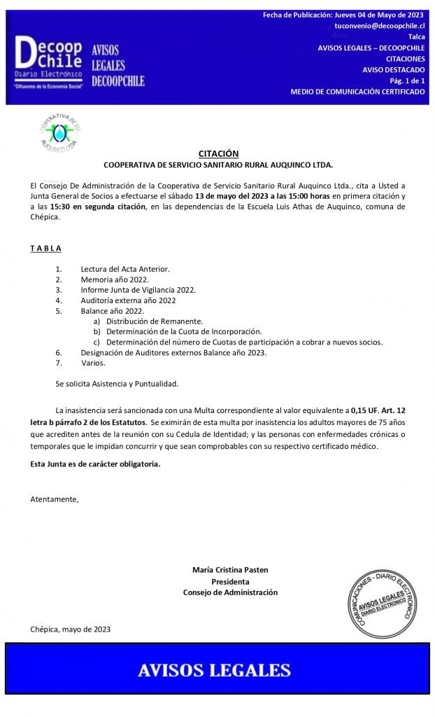 Se cita a Junta General de Socios Obligatoria Cooperativa de Servicio Sanitario Rural Auquinco Ltda, que se llevará a cabo el próximo 13 de Mayo de 2023.