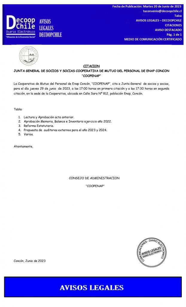 Se cita a Junta General de Socios y Socias Cooperativa de Mutuo del Personal de Enap Concón «Coopenap» que se llevará a cabo el próximo 29 de Junio de 2023.