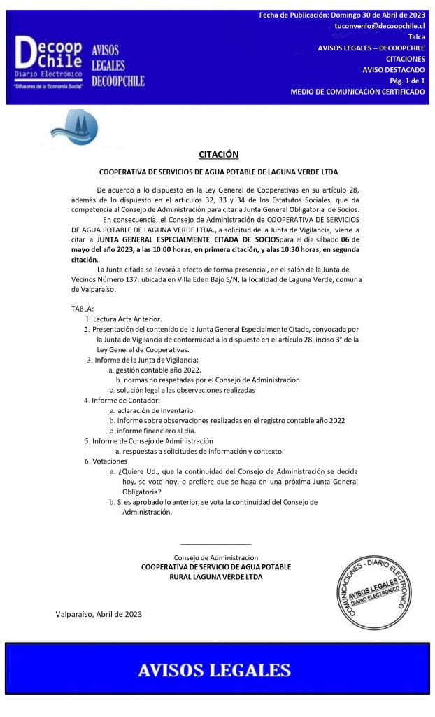 Se cita a Junta General Especialmente Citada de Socios Cooperativa de Servicios de Agua Potable Laguna Verde Ltda, que se llevará a cabo el próximo 06 de Mayo de 2023.