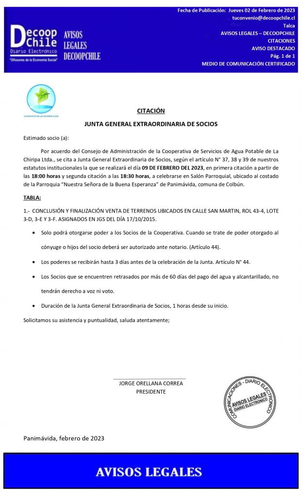 Se cita a Junta General Extraordinaria de Socios, Cooperativa de Servicios de Agua Potable de La Chiripa Ltda., que se llevará a cabo el próximo 09 de Febrero de 2023
