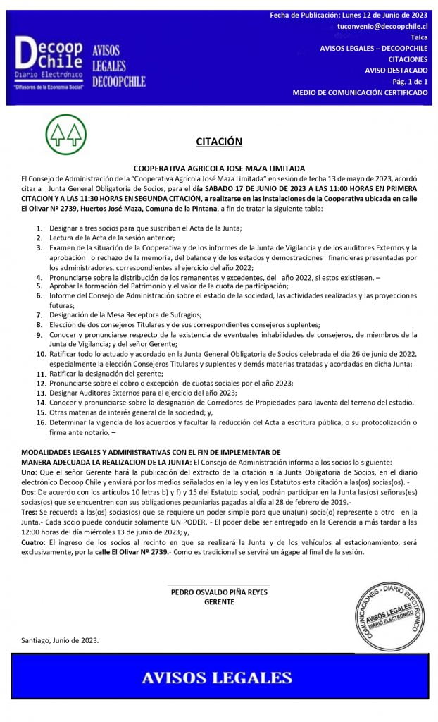 Se cita a Junta General Obligatoria de Socios Cooperativa Agrícola José Maza Ltda,. que se llevará a cabo el próximo 17 de Junio de 2023.