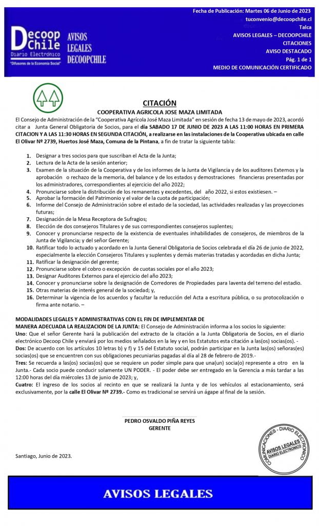 Se cita a Junta General Obligatoria de Socios Cooperativa Agrícola José Maza Ltda,. que se llevará a cabo el próximo 17 de Junio de 2023.