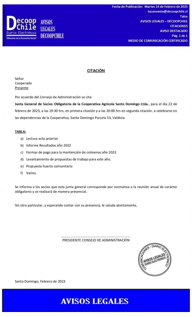 Se cita a Junta General Obligatoria de Socios, Cooperativa Agrícola Santo Domingo Ltda., que se llevará a cabo el próximo 22 de Febrero de 2023