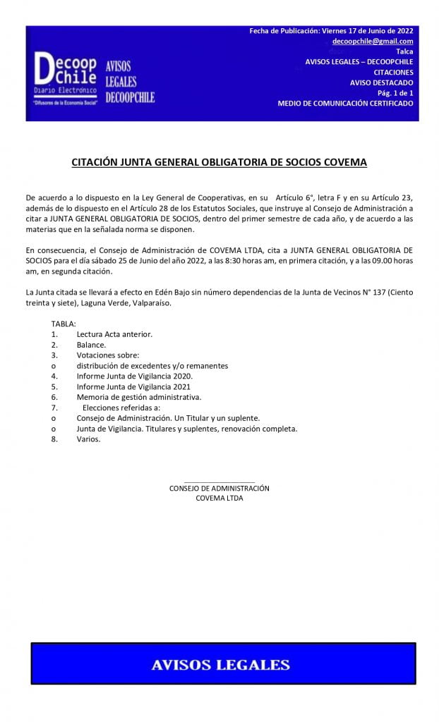 Se cita a Junta General de Socios Cooperativa Covema Ltda., que se llevara a cabo el próximo 25 de Junio de 2022.