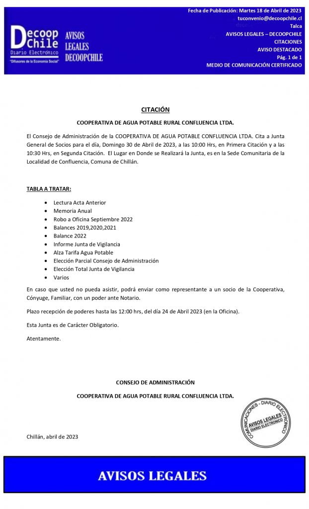 Se cita a Junta General Obligatoria de Socios Cooperativa de Agua Potable Confluencia Ltda, que se llevará a cabo el próximo 30 de Abril de 2023.