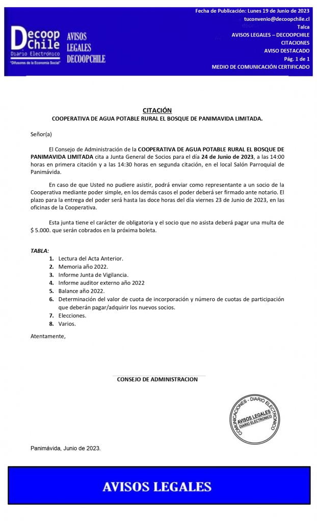 Se cita a Junta General Obligartoria de Socios Cooperativa de Agua Potable «El Bosque de panimávida Ltda» que se llevará a cabo el próximo 24 de Junio de 2023.