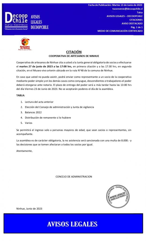 Se cita a Junta General Obligatoria de Socios Cooperativa de Artesanos de Ninhue, que se llevará a cabo el próximo 27 de Junio de 2023.