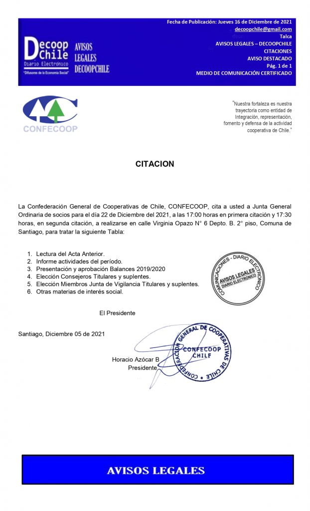 Se cita a Junta General Ordinaria de Socios de la Confederación General de Cooperativas de Chile, que se llevara a cabo el próximo 22 de Diciembre de 2021. DESCARGAR PDF